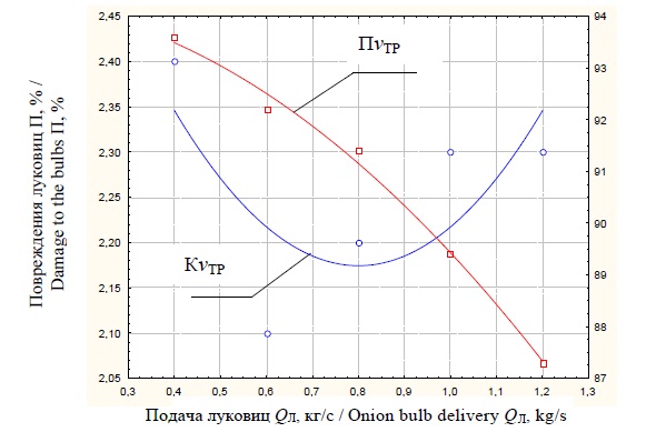 Максимальная точность сортирования товарной продукции более 91 % определяется числовыми значениями технологических параметров при адекватности математической модели выражения (10). Они определяются сравнением расчетного и табличного критериев Фишера (FТ = 2,1 > F = 1,97) в интервале значения поступательной скорости движения транспортера сортировального стола, равной 1,2 м/с, при повреждении луковиц 2,3 %, что соответствует агротехническим требованиям к послеуборочной обработке.