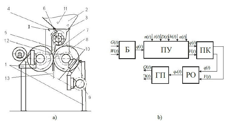 Fig. 1. a) Scheme of grain flattener with a feeding device I; b) block diagram of technological (working)