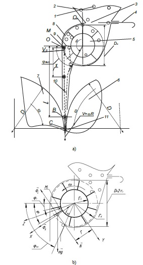 Fig. 3. a) Scheme of movement of the grain in the feeding device of the grain flattener;