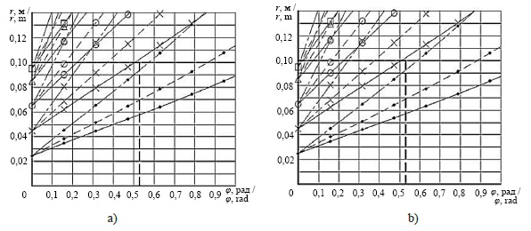 Выражение (6) с помощью разработанной компьютерной программы в приложении Miсrosoft Exсel позволяет определить и представить графически расположение r, м, частицы зерна на лопасти вальца, в любой момент времени t в зависимости от угла поворота вальца φ, град, при различных фиксированных значениях частоты его вращения n, мин–1, коэффициента трения f зерновки о материал лопасти вальца, а также от величины r0, м, начала движения зерновки по лопасти вальца. Полученные зависимости позволяют определить степень влияния различных факторов на параметры движения зерновки по лопасти вальца.