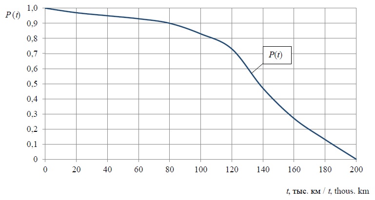 Анализ приведенной зависимости показал, что после достижения наработки 125 тыс. км интенсивность отказов такого элемента топливной системы, как регулятор давления топлива λ(t), начинает вырастать, а вероятность безотказной работы снижаться до значения P(t) = 0,47.