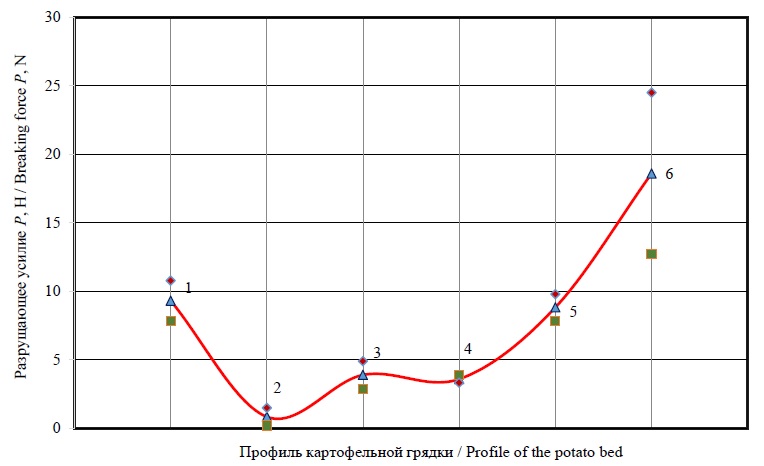Как видно из анализа исследований, самые большие разрушающие усилия для улучшения разрыхления почвы потребуются в четвертой и шестой зоне картофельной грядки, где больше всего прикасаются колеса трактора (рис. 1).