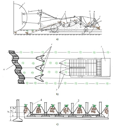 Для осуществления данной технологии при уборке картофеля предложен картофелеуборочный агрегат, общий вид которого показан на рисунке 2a; на рисунке 2b – технологическая схема картофелеуборочного агрегата; на рисунке 2c – фрагменты расположения рыхлительных лап в междурядьях и подкапывающего лемеха соответственно. Установленные рыхлительные лапы непосредственно обрабатывают эти зоны между грядками.