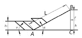 Если принять длину лемеха постоянной, то высота h подъема пласта лемехом будет линейно зависеть от угла наклона лемеха α. Из треугольника АСВ (рис. 3)