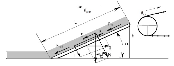 Одним из основных параметров подкапывающего лемеха картофелеуборочных машин является угол его наклона к горизонту α. Угол обуславливает наименьшее сгруживание лемеха, минимальное сопротивление движению почвенного пласта и высоту h подъема массы.