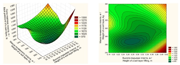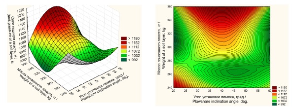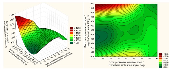 Полученные данные полнофакторного исследования подтверждают, что минимальная сила сгруживания Pmin = 1 001,96 Н лемеха достигается при угле установки лемеха α = 40º и высоте подъема пласта h = 0,3 м. При этом длина лемеха L = const.