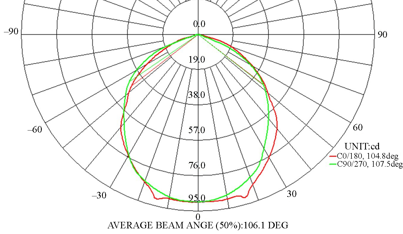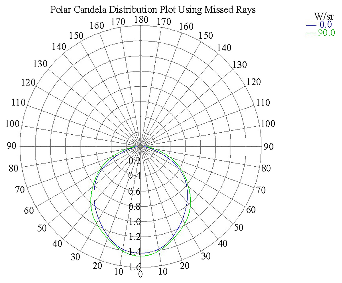 Исследование светораспределения фитооблучателя в пространстве показало, что КСС, измеренная с помощью гониофотометра (рис. 6), близка по форме к КСС, полученной в программе TracePro (рис. 4), и соответствует косинусному типу. Двойной угол половинной яркости (2ϴ0,5) составил 106,1 град., что позволяет обеспечить равномерное освещение больших площадей. При этом вся энергия излучения фитооблучателя направляется в одну полусферу, что способствует эффективному освещению растений, обеспечивая им необходимую интенсивность света для фотосинтеза и роста.