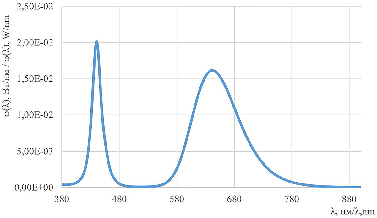 Требуемый спектр излучения для выращивания растений можно получить несколькими способами. В одном из исследований [8] осуществляется оценка радиационной среды, формируемой с помощью фитооблучателя на основе узкополосных светодиодов. Спектр излучения фитооблучателя с такими светодиодами представляет собой набор линий излучения, каждая из которых соответствует определенной длине волны. Таким образом, требуемый спектр излучения получается за счет комбинирования излучений узкополосных светодиодов [9; 10]. Интенсивностью узкополосных светодиодов можно управлять по отдельности, что позволяет точно регулировать спектральный состав и интенсивность света, подаваемого на растения. Гибкость в управлении спектром излучения имеет ключевое значение для оптимизации фитооблучения в различных стадиях роста растений и для различных видов культур. Например, в разные периоды роста растений требуется различная комбинация синего и красного света, а также других цветовых диапазонов, чтобы стимулировать определенные физиологические процессы: фотосинтез, цветение и формирование плодов [11].