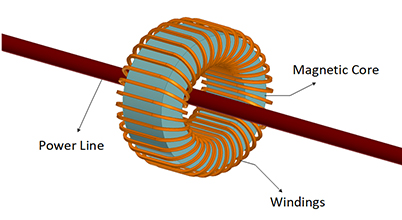 The number of turns in the voltage winding induced through the toroidal core depends on variables, such as magnetic permeability, frequency, line current, and core size. The induced voltage can be obtained along with a mutual inductance, as shown in Equation 7
