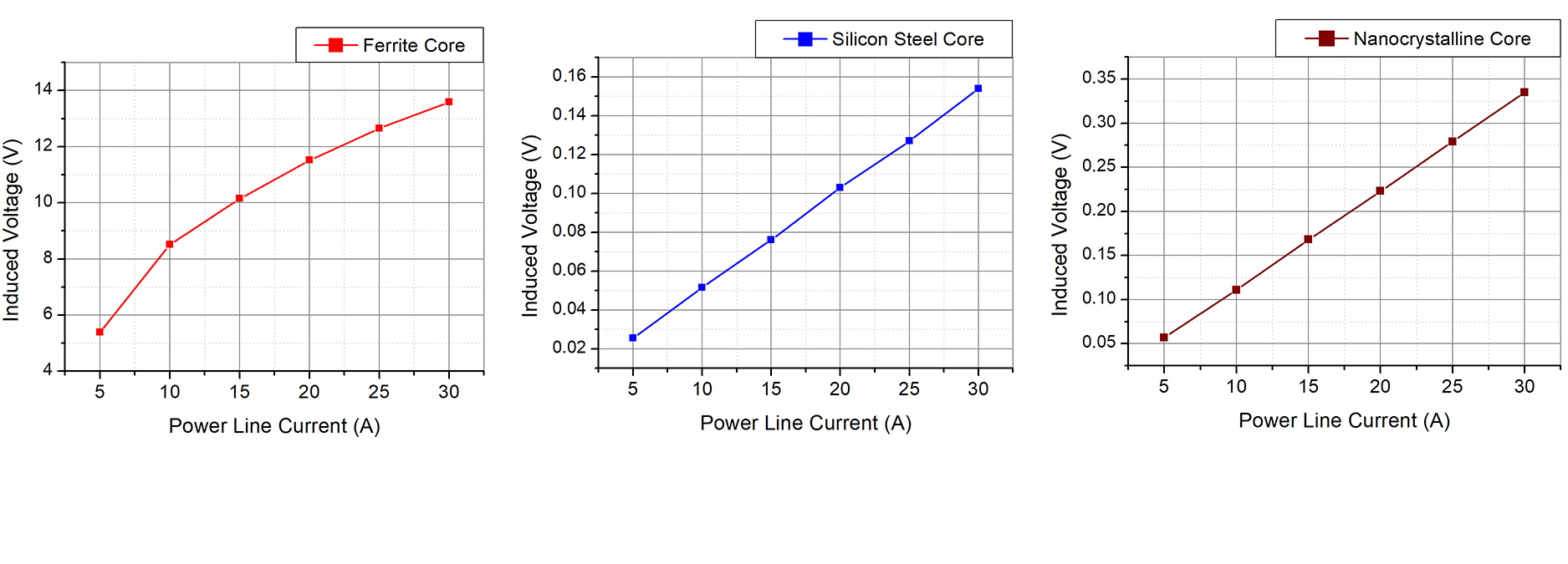 Similarly, the graphs in Figure 6 show the voltage variations induced by 60x30x20 mm cores according to the line current.