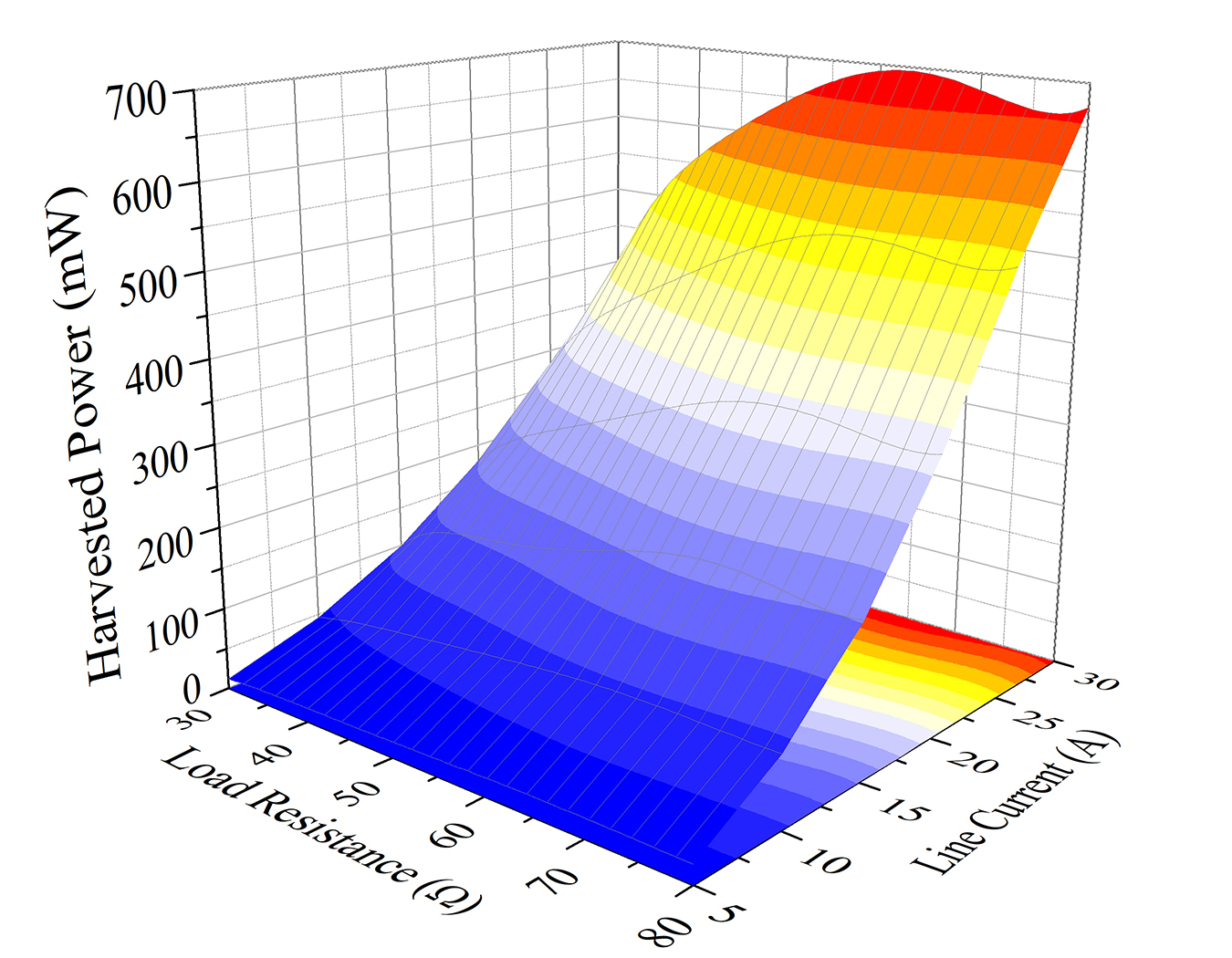 At a line current value of 10 A, the maximum power harvested was 88.943 mW at a load resistance of 66.869 Ω. At 20 A, the maximum power harvested was 343.561 mW at a load resistance of 64.8485 W. Finally, at a line current of 30 A, the maximum power obtained was 695.516 mW at a load resistance of 62.828 W.