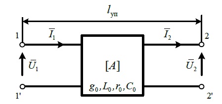 Для получения аналитических выражений, связывающих входные электрические параметры рельсовой линии с первичными и вторичными параметрами рельсовой линии, представим дифференциальную схему замещения, представленную на рисунке 2, в виде обобщенной четырехполюсной схемы замещения рисунка 3.