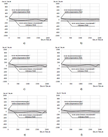 Анализ результатов исследований двухфазного формирования решающих функций при различных двумерных образах, представленных на графиках и в таблице результатов исследований, показывает, что в зависимости от сочетаний признаков в образах максимальная ошибка определения координат может изменяться от 91,489 до 199,34 м при длине участка приближения 2 000 м, и погрешность составляет от 9,967 до 4,574 %. Минимальная погрешность достигается при использовании в образе X = (U1, I1). Если сравнить результаты, полученные однофазным формированием решающей функции, представленные в таблице 1, то минимальная погрешность составит 5,829 %, или 116,581 м, при сочетании в образе X = (φ1, I1). Удовлетворительным условием решения задачи формирования решающей функции считается нахождение в пределах зоны максимального допустимого отклонения 5 % (рис. 9e, 9f ) графика d(X ). Необходимо иметь в виду, что результаты однофазного формирования решающей функции получены решением системы уравнений (11) при воздействии всего лишь одного дестабилизирующего воздействия g0, а результаты двухфазного формирования решающей функции – при воздействии нескольких дестабилизирующих воздействий и самонастройкой полиномов решающих функций.