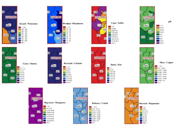 В целом по полю значение марганца очень высокое, кобальта повышенное, кальция высокое, гумуса среднее, меди среднее, магния низкое, цинка очень низкое.