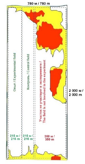 В результате поле разделили на части так, чтобы опыт 43 га (использовались шины низкого давления) и контроль 43 га (использовались шины стандартного давления) были в однородной зоне, а неоднородный участок не задействовали в эксперименте (рис. 5).