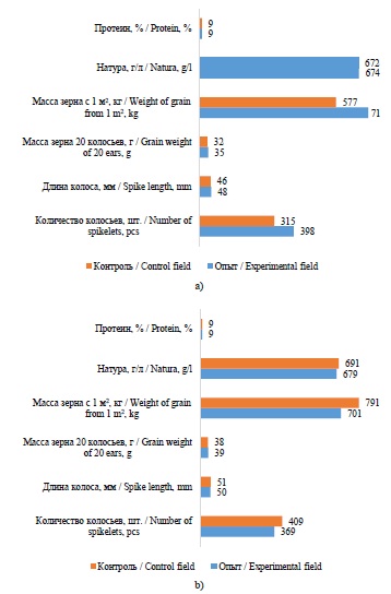 Далее сравнение выполнено по следу (рис. 14а) и вне следа (рис. 14b) по опыту и контролю. Можно заметить, что большая часть показателей по следу выше на 4–24 % в опыте, вне следа, наоборот, на 2–13 % выше по контролю.