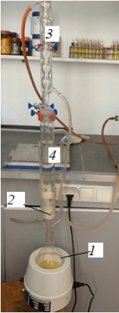 The oil content of the raw material is determined by the Soxhlet method. The device is mounted on the round-bottomed bulb 1, which already contains the extracting solvent (hexane was used in the study), then the refrigerator is installed 3. In the center of the extractor 4, there is placed a cardboard case (cartridge) 2, in which there is 5 g of the sample between two layers of cotton wool (Fig. 5). Hexane is brought to a boiling point and, in the course of the evaporation, enters the siphon by passing through the side outlet. When the solvent fills the cavity, the substance is extracted. When hexane reaches the upper level in the siphon, it is devastated: hexane drains into the bottom round sample and the cycle repeats. The extraction time is eight hours. Next, we place the round flask with the remaining fat on the bottom in a preheated up to 105 degrees for 1 hour. After drying the flask is placed in the desiccator and then weighed. Subsequent weighing is carried out after re-drying for 30 minutes. Drying and weighing shall be repeated until the difference between the two consecutive weighings is no more than 0.001 g.