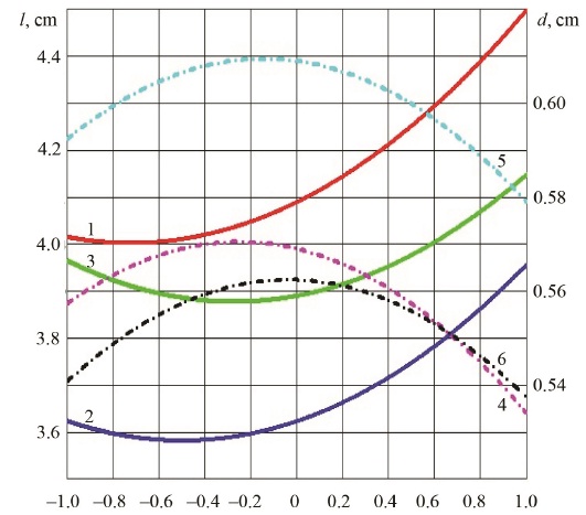 The task solution requires the development of a mathematical model that describes the growth of the stem geometry to control the regimes of lighting in the greenhouse complexes. Therefore, the length l and the diameter d were taken as a response in the study of the efficiency of the blue-red spectrum on the growth of seed potato plants [12]. The result of the study is the mathematical model of the growth of the length and the diameter of the plant stem: