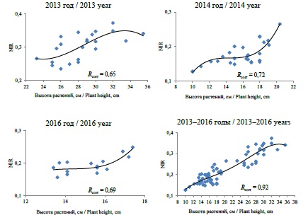 При анализе связи высоты растений и коэффициентов спектральной яркости в красной области спектра электромагнитных волн (RED) коэффициенты корреляции составили значения −0,54 в 2013 г., –0,18 в 2014 г. и 0,69 в 2016 г., по объединенным данным за период 2013‒2016 гг. – минус 0,40. Это объясняется тем, что RED напрямую связан с максимумом поглощения хлорофилла, а у растений нет прямой зависимости их высоты от количества зеленых пигментов.