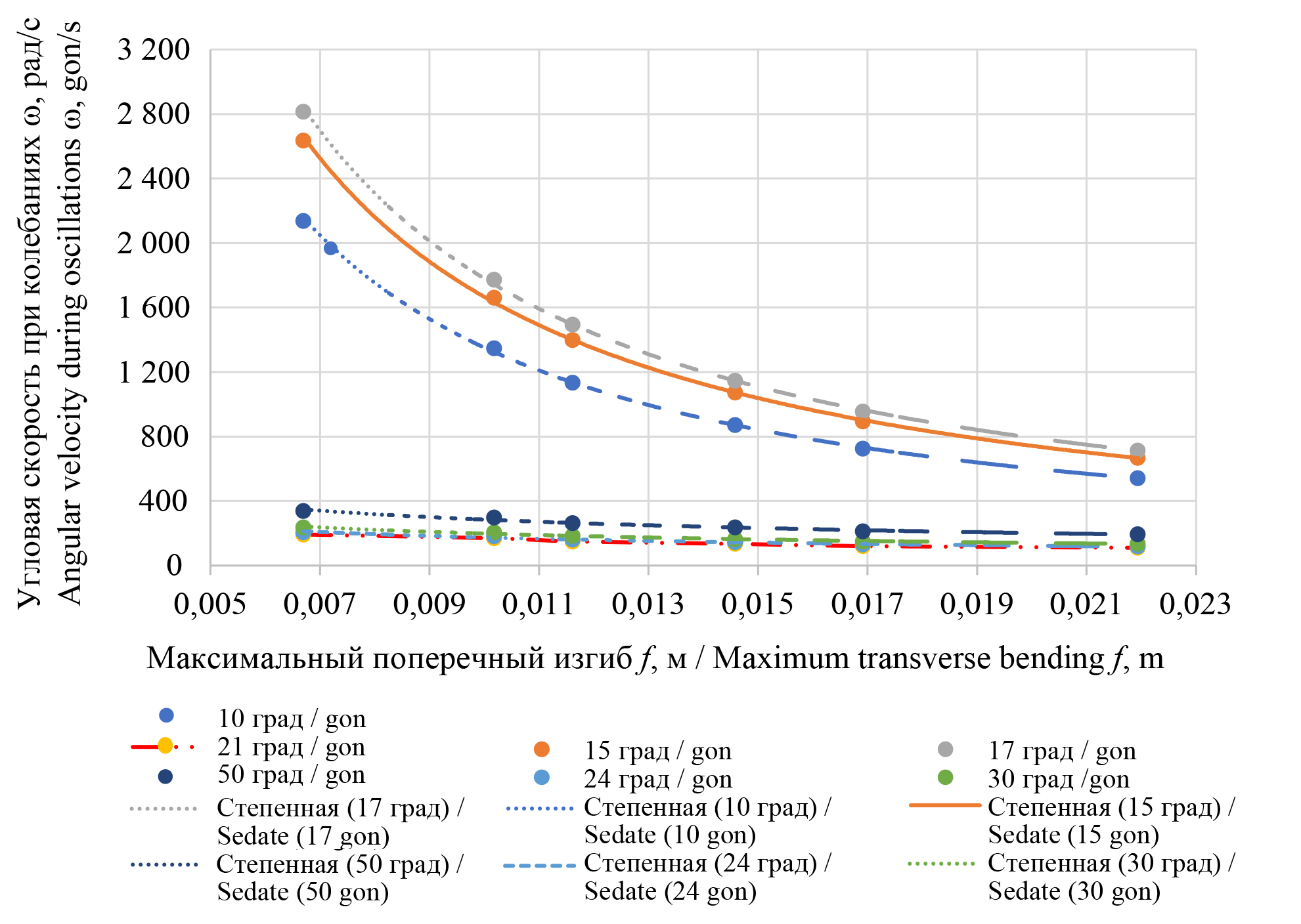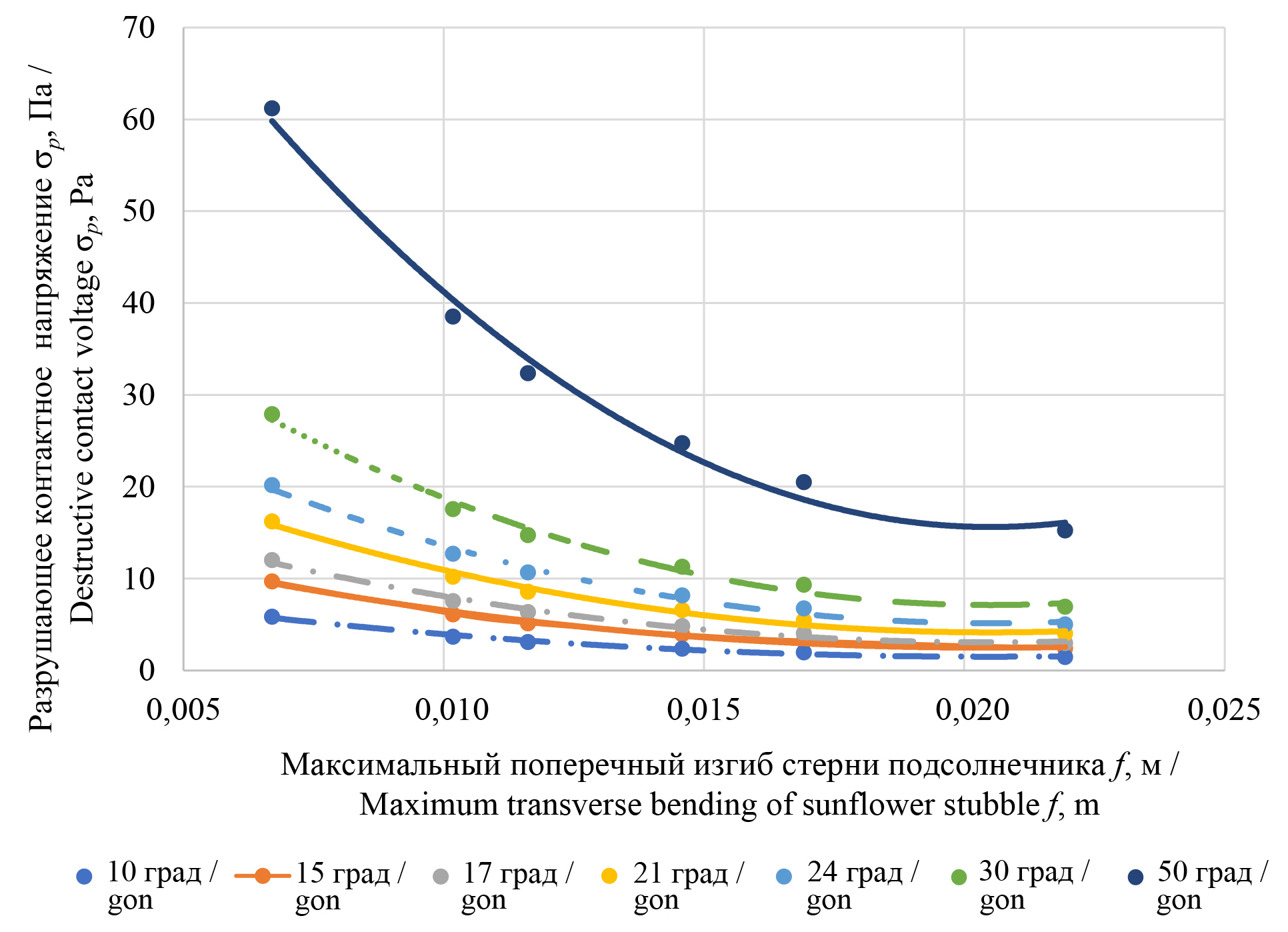 Анализ зависимостей на рисунке 7 показывает, что разрушающее контактное напряжение снижается при росте максимального поперечного изгиба стерни подсолнечника. Повышение угла наклона стерни подсолнечника приводит к увеличению разрушающего контактного напряжения с уменьшением максимального поперечного изгиба стерни подсолнечника.