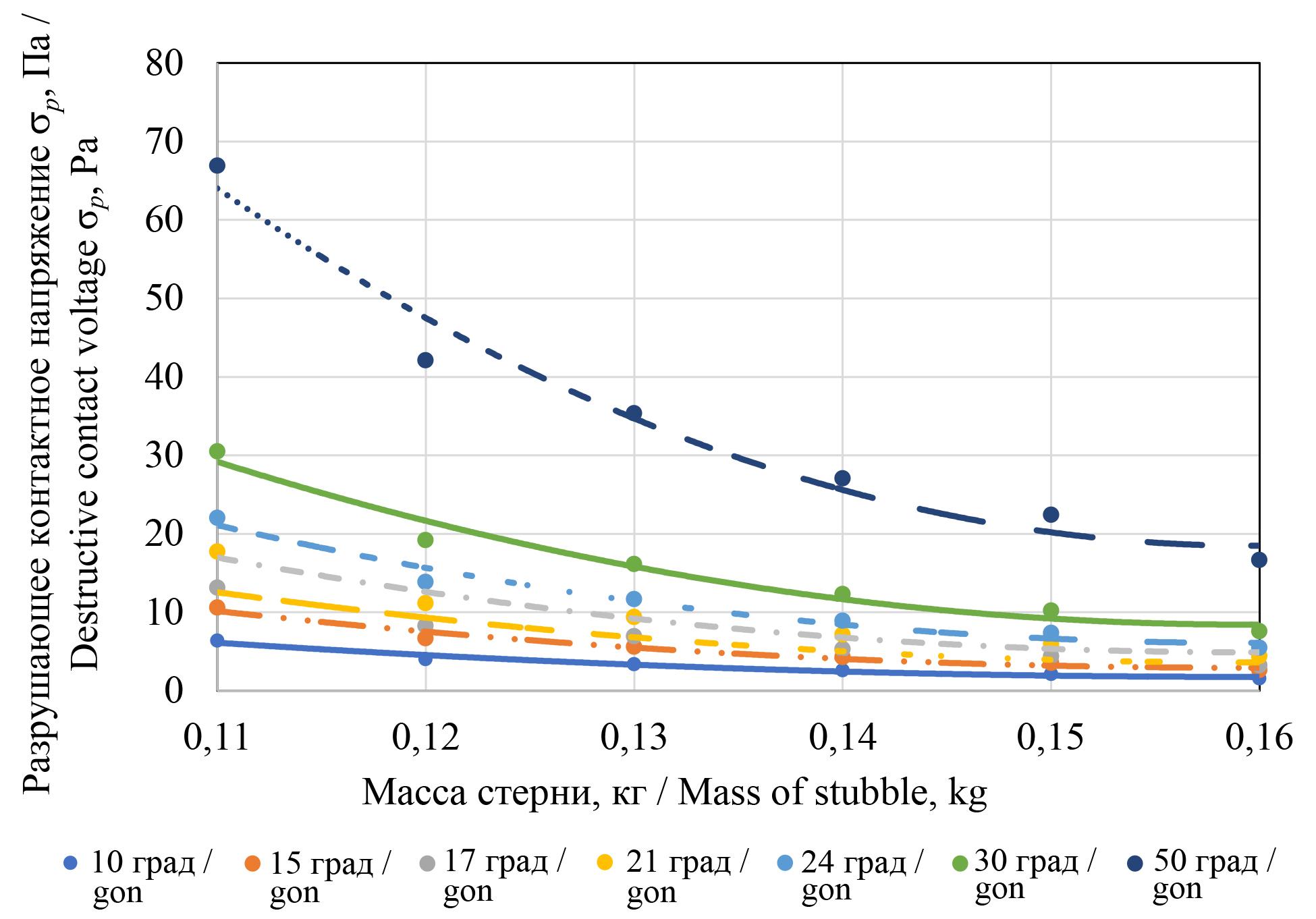 - Получено выражение, определяющее разрушающее контактное напряжение в зависимости от физико-механических свойств стерни подсолнечника и угла его наклона относительно почвы.