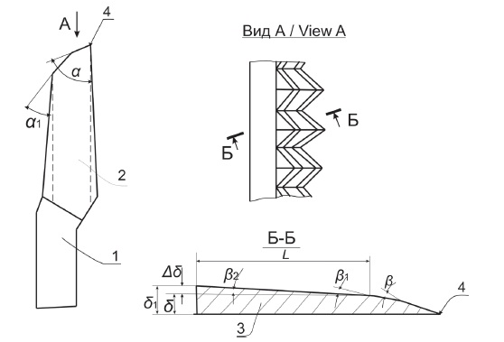 Конструкции ножа с клиновидными режущими элементами не получили широкого распространения по причинам низкого качества свекловичной стружки и сложности изготовления инструмента [19; 20].