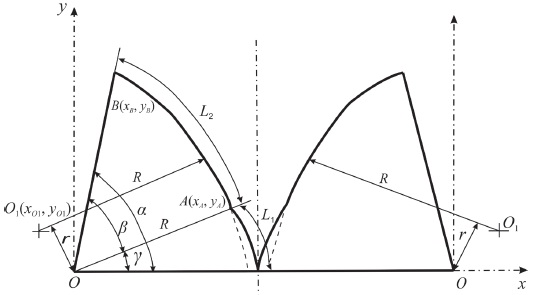 Исходя из схемы, приведенной на рисунке 6, размеры граней формируются за счет нового деформирующего профиля накатной поверхности, образуемого на расстоянии r, равном размеру смещения центра О в точку О1, и появляющихся при этом углов α, β и γ. Координата точки О1(xО1, yО1) описывается уравнением окружности: