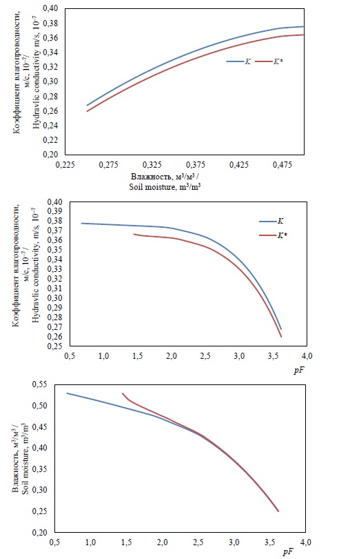 В работе будем придерживаться общепринятых обозначений для потенциала почвенной влаги. Исторически сложилось так, что потенциал почвенной влаги принято выражать десятичным логарифмом давления, выраженным в сантиметрах водного столба ( pF ). На верхних двух графиках рисунка 1 показано изменение функции влагопроводности светло-серой лесной почвы (от влажности и от потенциала), а на нижнем – основной гидрофизической характеристики почвы при добавлении монофосфата калия (из расчета 30 г на 10 л). На рисунке 1 K соответствует чистой воде, а K* соответствует воде с монофосфатом калия. Масштабы осей подобраны таким образом, чтобы относительно небольшие изменения функций сделать заметными.