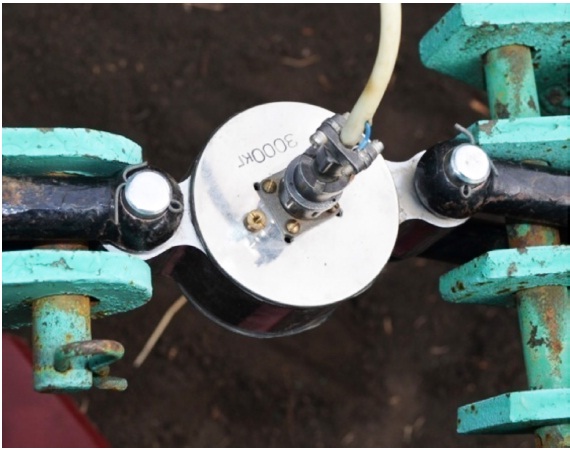 Исследования проводились на глубине обработки почвы, устанавливаемой на 25, 30, 35 см, и при скорости движения, соответствующей I, II, III передачам трактора. Тяговое сопротивление измеряли посредством тензометрического звена, размещенного на экспериментальной установке перед рабочим органом (рис. 2).