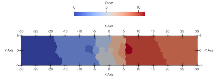 Расчет производился с использованием параллельного комплекса программ на 12 процессорах [23]. На рисунке 2 представлена декомпозиция расчетной области по процессорам.