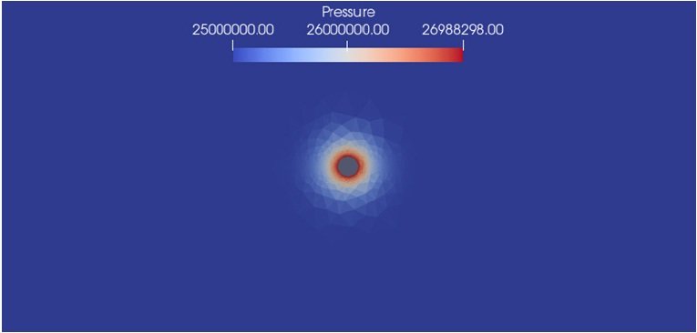 На практике наибольший интерес представляет состояние призабойной зоны пласта. В связи с этим, а также из-за большого масштаба задачи дальнейшие рисунки представляют не всю расчетную область, а ее часть, приближенную к скважине. На рисунке 3 представлена расчетная сетка возле скважины, диаметр скважины 0,05 м.