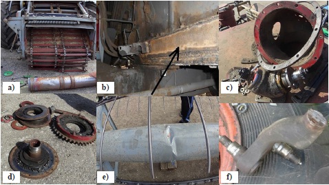 Fig. 3. External manifestations of failures of the John Deere combine: a) destruction of the cutter drive