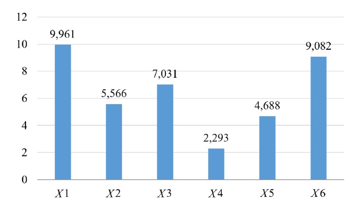 На рисунке 2 показано сравнение всех весовых коэффициентов формулы (1), из которого следует, что наиболее значимым фактором негативного воздействия сельхозпроизводства на водные объекты является фактор X1 (технология внесения удобрений), чуть меньшую значимость имеет фактор X6 (использование цифровых технологий в технологических процессах), наименьшее значение имеет фактор X4 (соблюдение агротехнологических требований без нарушения норм и требований законодательства).