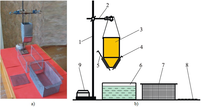 a) general view of the setup; b) scheme of the setup; 1– laboratory stand; 2 – holder; 3 – bunker;
