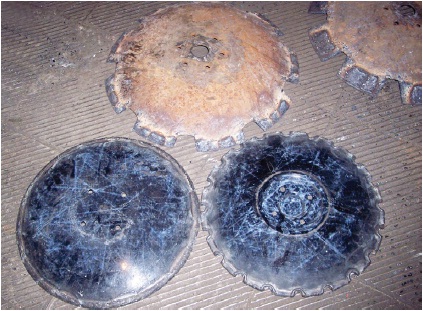 В результате производственных испытаний установлено, что два диска «ромашка» имели нарушение геометрической формы (загиб лепестка), на одном из них имелись трещины в месте крепления. Такие дефекты характерны в случае столкновения дисков с препятствиями в виде камней (валунов). Средняя наработка на отказ дисков «ромашка» из стали 65Г 16–18 га, наплавленных порошковой проволокой Н560.02 31–33 га, электродами Т-590 32–35 га, порошковой проволокой ПП-Нп200Х15С1ГРТ 35–37 га, порошковой проволокой ПП-Нп280Х9Ф7СГ4 41–44 га. Диски с вырезами имели сопоставимые значения средней наработки с дисками «ромашка», а у дисков со сплошным лезвием наблюдался значительный разброс данных (40–48 га), видимо, вследствие забивания почвой и проявления эффекта протаскивания и потери оборотов.