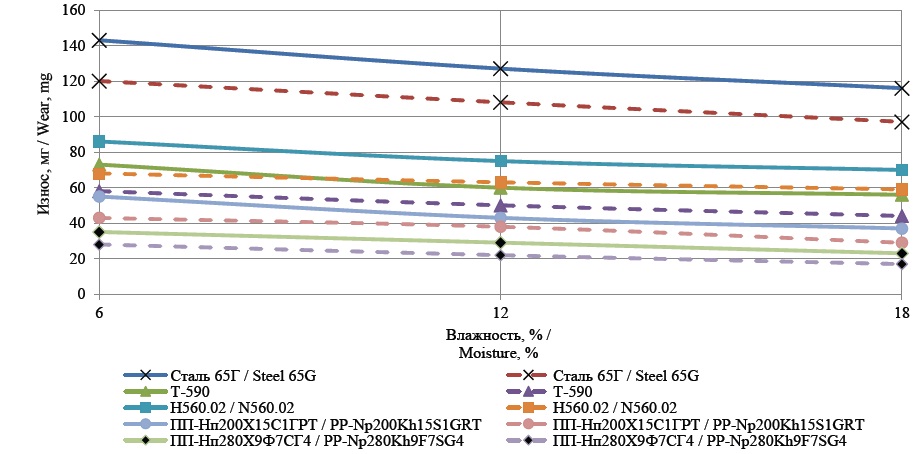 В реальной почве практически всегда имеется незначительное содержание кислот и солей, которые при растворении в воде способствуют повышению активности адсорбционной среды на поверхности трения и ускоряют процесс разрушения микрообъемов материала при многократном воздействии твердых частиц. Однако при данных испытаниях фактор повышения активности среды не реализуется. Твердость и структурное состояние исследуемых материалов являются основными факторами, определяющими их износостойкость.