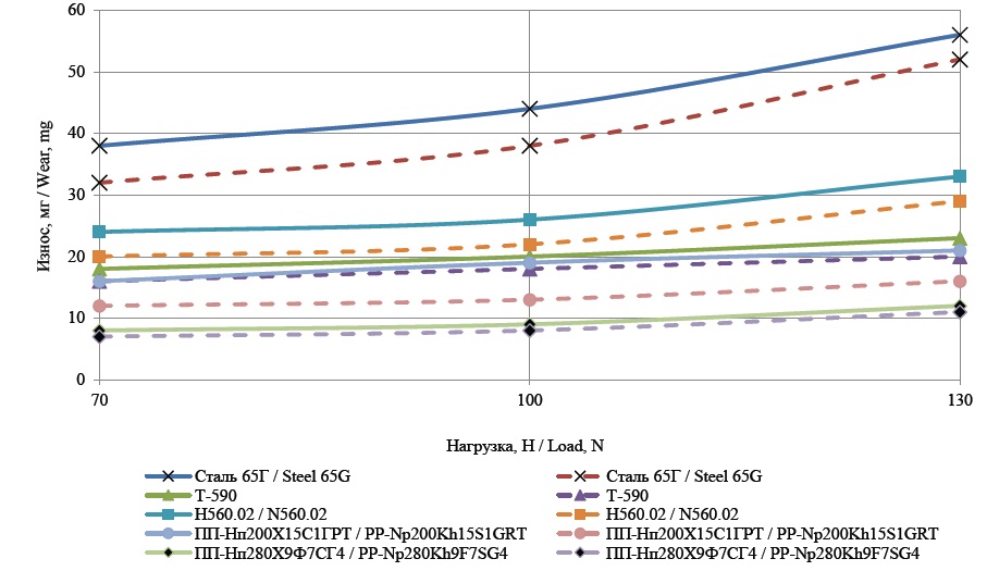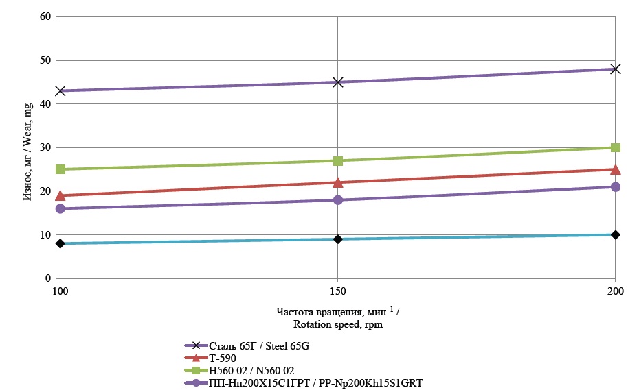 Анализ влияния нагрузки в контакте образцов с роликом при частоте вращения последнего 100 мин–1 позволил выявить нелинейную зависимость увеличения износа с ростом нагрузки. При этом, чем выше износостойкость материала, тем указанная зависимость более линейна. Выявленный ранее ряд износостойкости материалов при переходе к другому виду испытаний не изменился. Наиболее износостойкой оказалась наплавка порошковой проволокой ПП-Нп280Х9Ф7СГ4.