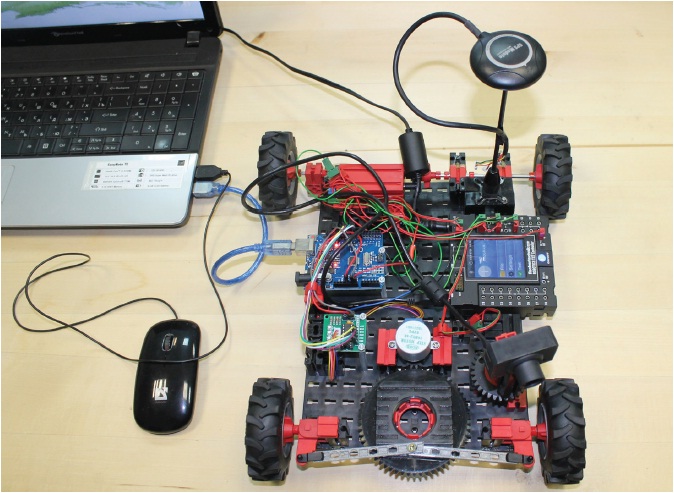 На рисунке 5 показана натурная модель, обеспечивающая тестирование всех рассмотренных алгоритмов и включающая в себя основной привод движителей, рулевое управление (в варианте классической компоновки) и поворот видеокамеры. Видеоролик наглядно иллюстрирует работу натурной модели9. Траекторное управление рассчитывалось при этом сразу для всей траектории, то есть возможное проскальзывание, неровность поверхности движения и прочие возмущения не учитывались.