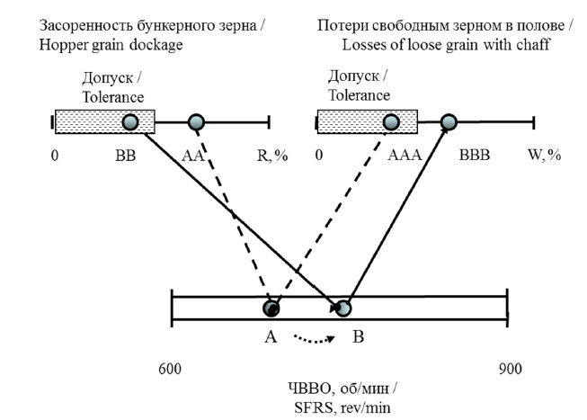 Задача корректировки осложняется наличием перекрестных зависимостей между регулировочными параметрами и показателями качества работы. Для иллюстрации этих зависимостей на рисунке 2 в качестве регулируемого параметра представлена ЧВВО. На горизонтальной шкале приведены рекомендуемые границы изменения значений ЧВВО для конкретной культуры (например, 600–850 об/мин). Примем, что в соответствии с конкретными целями уборки и внешними условиями значение ЧВВО соответствует точке A. На вертикальных шкалах (в целях упрощенного представления условий задачи) представлены только 2 показателя качества – «засоренность бункерного зерна» и «потери свободным зерном с половой». На каждой из этих шкал приведены границы изменчивости показателя качества и условно отображены границы допустимых значений данного показателя в соответствии с агротехническими требованиями (допуск).