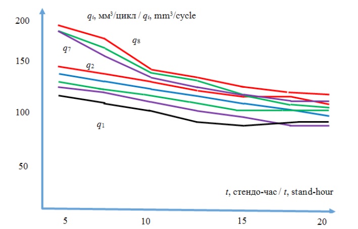 Ломанные кривые: q1…q8 – пусковая цикловая подача насоса, мм3/цикл; t – наработка, стендо-час