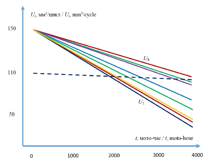 pairs. Smooth curves: U1…U8 – starting cycle pump flow, mm3/cycle; t – operating time, moto-hour;