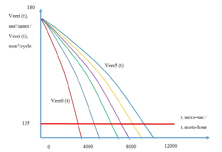 На рисунке 9 приведены «предельные веерные кривые изнашивания» плунжерных пар насоса ТНВД – 4МТНМ, мм3/цикл, (типа 2…6), а также предельное значение цикловой подачи – 135 мм3/цикл.