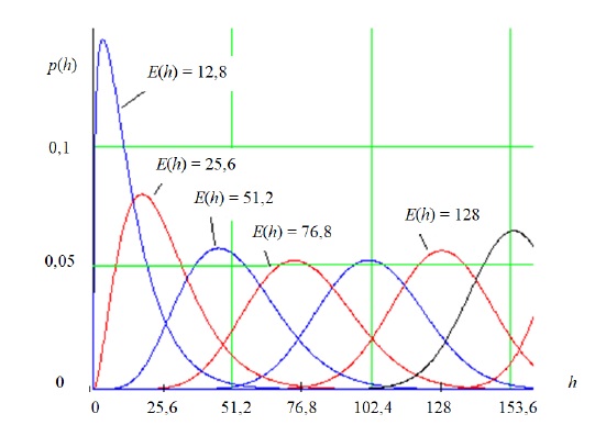 Из рисунка 2 видно, что при значениях математического ожидания E(h)=12,8, E(h)=25,6 распределение расстояний Хэмминга становится существенно асимметричным [28; 29]. Это означает, что номограмма данных рисунка 1 при малых значениях математических ожиданий нуждается в значительных поправках DH256. Вычисление поправок выполняется путем нормирования расстояний Хэмминга, приводящего все возможные состояния к интервалу от 0 до 1. В итоге получается 8-разрядная двоичная таблица преобразований. Далее под заданное значение асимметрии подбираются два параметра бета-распределения. Уже в пространстве бета-распределений по формуле, аналогичной формуле (4), находится вероятность ошибок второго рода на 32-разрядной вычислительной машине: