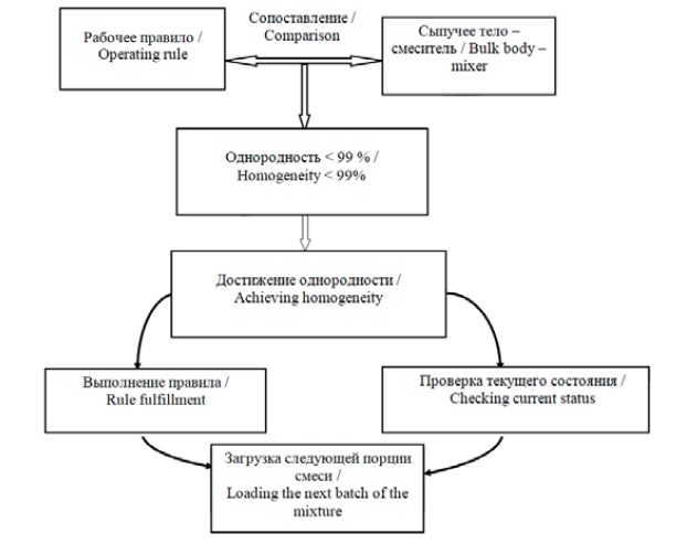 Компонентами интеллектуальной системы управления динамическими процессами смешивания будут: рабочая память M, множество нечетких правил R, описывающих выполнение операций перемешивания, и стратегия выбора правил в зависимости от состояния системы S. Таким образом, интеллектуальная система I представлена в виде тройки: