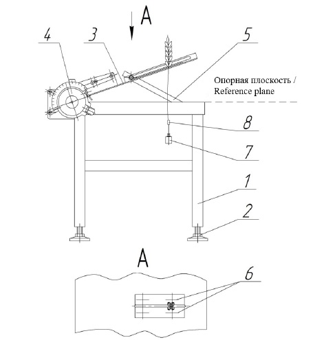 Методика исследования состоит в следующем. Во время регулирования опоры 2 выставлялась опорная плоскость измерительного устройства в горизонтальном положении. Для оценки соответствия опорной плоскости горизонтали использовался ватерпас. Ширина щели между пластинами-имитаторами выставлялась с использованием штангенциркуля. Описываемые измерения были выполнены с шириной щели, равной 7 мм. Далее площадка с пластинами поворачивалась в промежуточное положение, устанавливался колос, с использованием зажима 8 крепилась гиря 7 из набора разновесов. С использованием угломерной головки площадка поворачивалась до тех пор, пока колос не начинал скользить по пластинам. Определив примерный диапазон угла трения, исследуемый параметр уточнялся. Для этого площадка поворачивалась и фиксировалась в нескольких точках в районе определенного диапазона, и устанавливался угол трения.