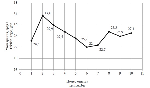Результаты экспериментальных исследований разбиты на 2 группы. При отсутствии эффекта защемления колоса между зубьями гребенки угол трения изменялся в диапазоне 22,0–27,1°. При появлении эффекта защемления колоса угол трения увеличивался и составил 26,4–31,5°.