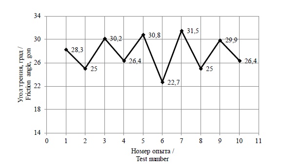 Результаты измерения углов трения гребенки о колос пшеницы сорта «Московская 56» представлены на диаграмме рисунка 3. Угол трения изменялся в диапазоне от 22,7° до 31,5°.