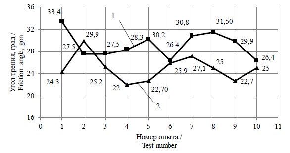Результаты измерения углов трения гребенки о колос пшеницы сорта «Московская 40» представлены на диаграмме рисунка 2. Как видно из диаграммы, угол трения изменялся от 22,0° до 33,4°.