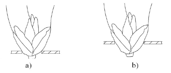 Очевидно, что коэффициент трения зависит не столько от геометрических размеров колоса, сколько от соотношения геометрических размеров и ширины щели между зубьями гребенки. Наблюдения в ходе опытов позволили установить природу данной зависимости. На рисунке 5 показаны два случая взаимодействия колоска колоса пшеницы с зубьями очесывающей гребенки: а) зубья взаимодействуют с колоском у его основания; б) зубья взаимодействуют с колоском ближе к его центру. Во втором случае имеет место эффект защемления колосков колоса пшеницы между гребенками. Этим и объясняется увеличение угла трения при малых размерах колоса относительно щели очесывающей гребенки.