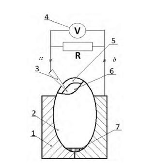 3. Fig. 2. Functional diagram of the inclusion of wheat grain in the electrical circuit: 1 – electrode clamp; 2– wheat grain; 3 – electrode needle; 4 – voltmeter; 5 – grain shell; 6 – area of a grain germ; 7 – tuft of grain